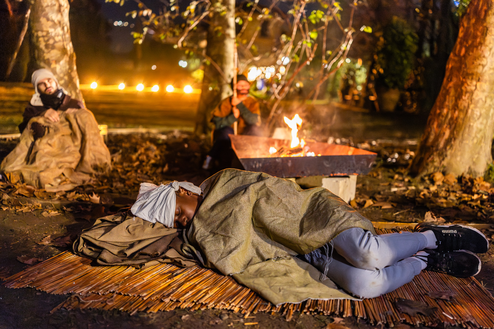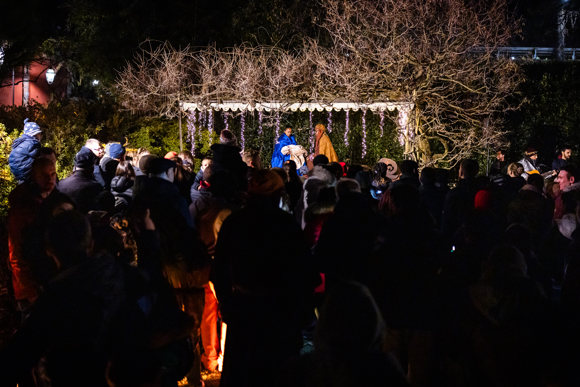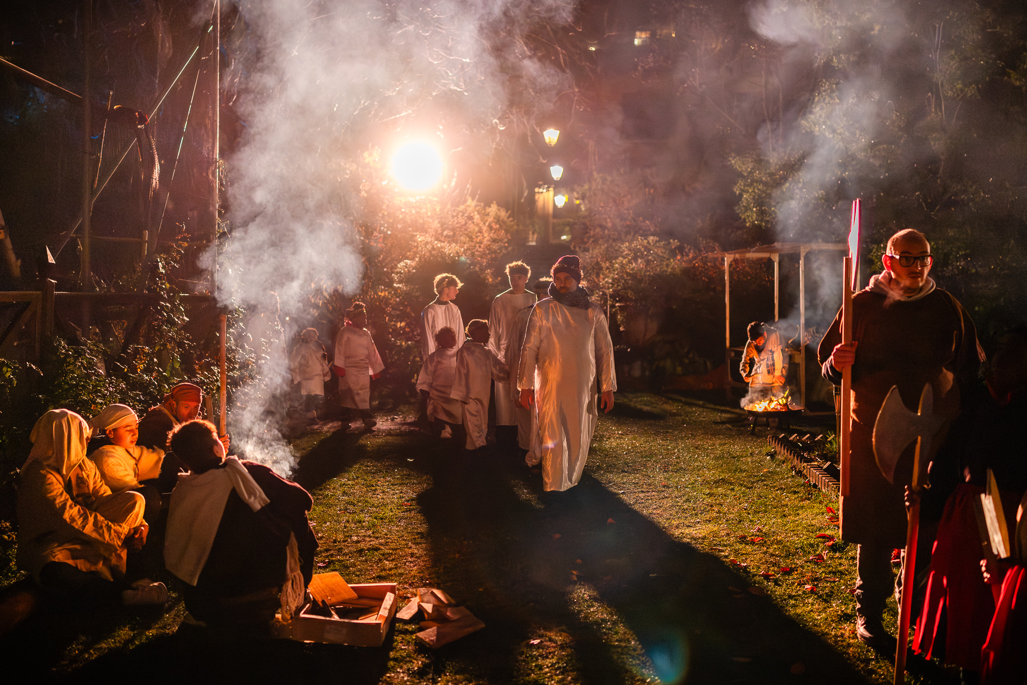 Poi arrivano i fuochi, la penombra, i pastori. È una scena che parla a tutti: gli angeli svegliano i pastori con un annuncio che somiglia a una notizia impossibile, imprevista. E si riparte.